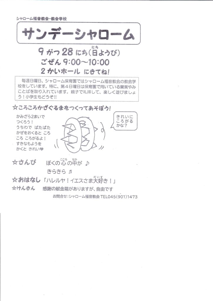 教会学校 幼・小・中・高科は、シャローム保育園にて午前9時~午前10時まで。9/28のサンデーシャロームの案内チラシもご覧ください。(ここをクリックしてご確認ください。)